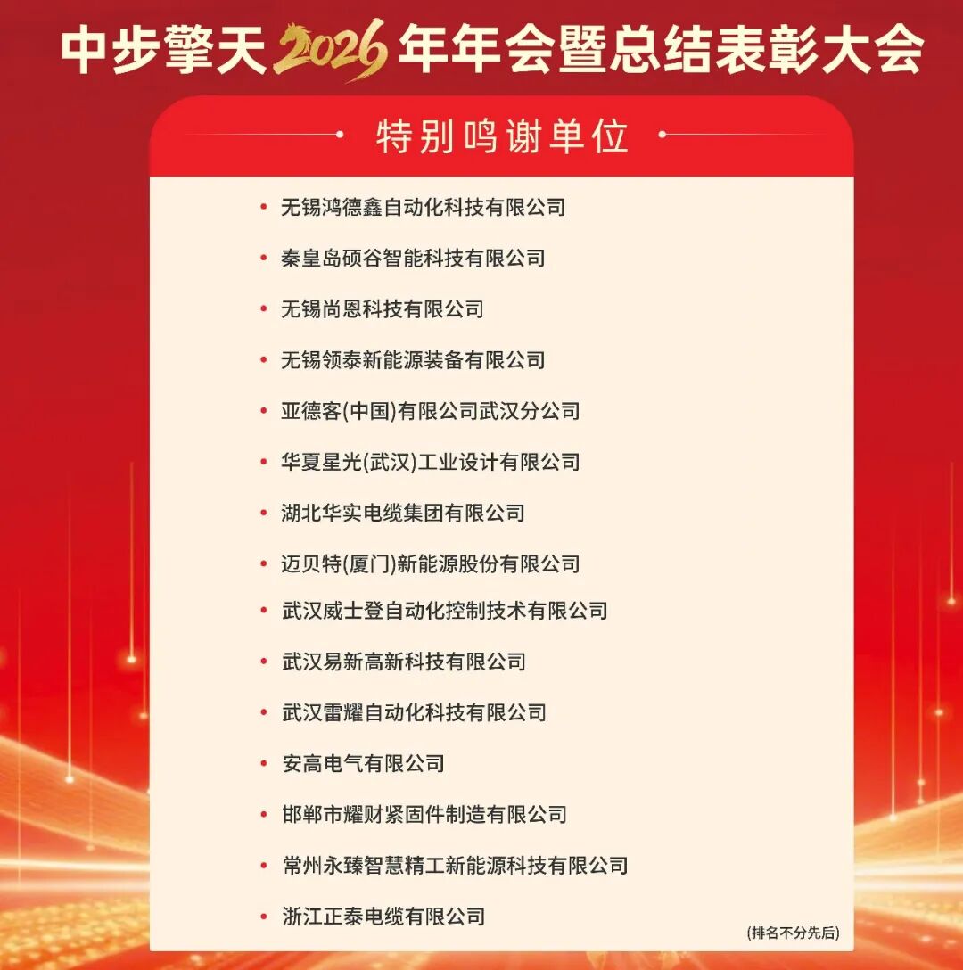 聚势∙笃行∙擎新程|中步擎天2026年年会暨总结表彰大会圆满举行发表时间:2026-01-26 18:58 2026年1月23日,中步擎天举办以“聚势∙笃行∙擎新程”为主题的2026年年会暨总结表彰大会。公司逾三百名员工与来自各行业的领军企业代表、合作伙伴齐聚一堂,共同回顾奋进历程、表彰**贡献、擘画发展蓝图。 ![]() ![]() ![]()